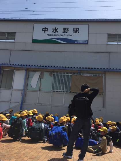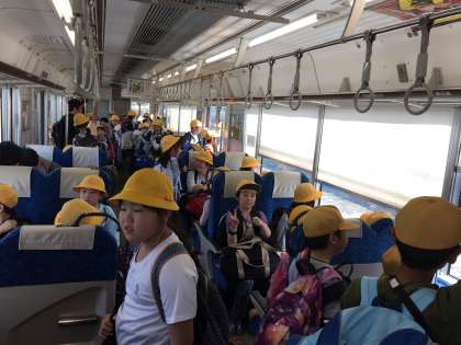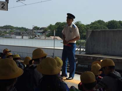駅員さんのお話を上手に聞いて、電車に乗った5年生。