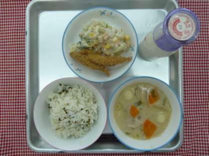 わかめごはん・洋風団子汁・きびなごのカリカリフライ・大豆サラダ・牛乳でした。
