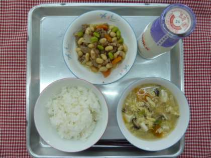 今日は、ごはん・かきたま汁・ピリ辛大豆・牛乳でした。