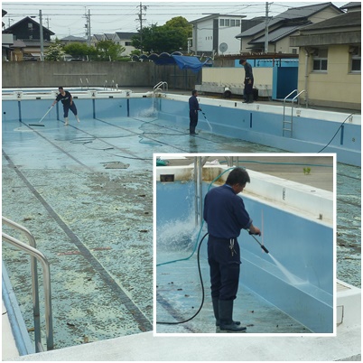 清掃業者の方が来校され、プール清掃を行ってくださいました。