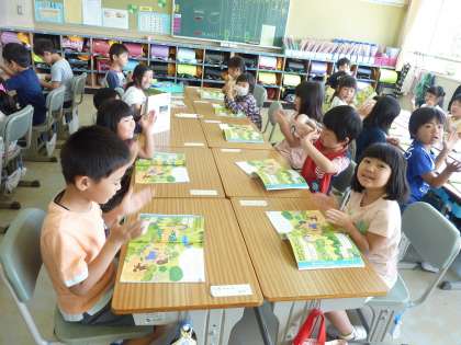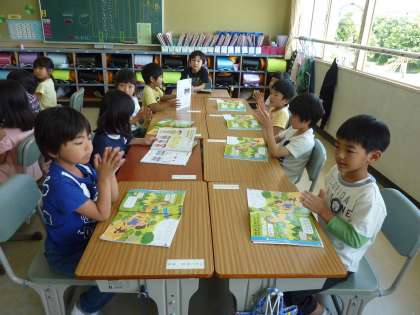 となりのトトロの「さんぽ」を手拍子をしながら歌う1年生。