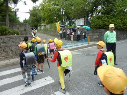 空は曇り空でしたが、子どもたちの元気なあいさつが校門に響きました。