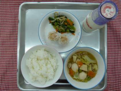 ごはん・八宝菜・えびシューマイ・中華風ごまあえ・牛乳でした。