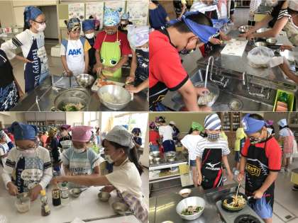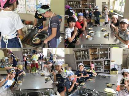 5年生の時に作ったエプロンを着て、野菜ためを作る6年生。