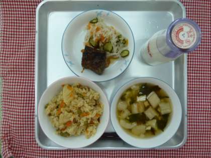 たけのこごはん・ふだま汁・宗田かつおのおかかあえ・切り干し大根の甘酢あえ・牛乳でした。