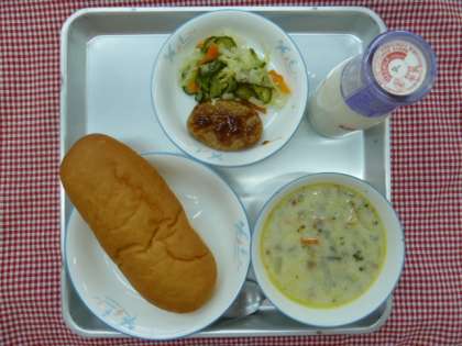 今日は、ロールパン・豆乳スープ・照り焼きハンバーグ・ミニフレンチサラダ・牛乳です。