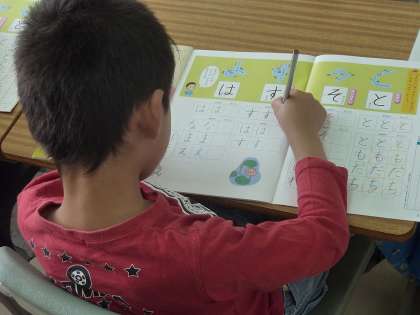 書写の授業で「す」を書く1年生。