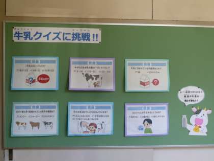 6月1日が「世界牛乳の日」ということにちなみ、今月は給食に毎回出ている「牛乳」についての掲示をしてあります。