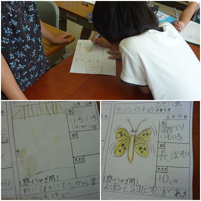 羽の細かい様子を描いたり、虫かごのどこにとまっているかを描いたり、子どもたちの視点で記録していきます。