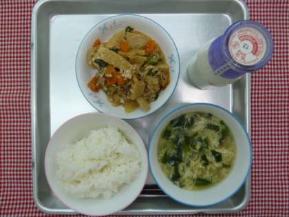 今日の給食は、ごはん・にらたまスープ・生揚げとチンゲン菜の炒め物・牛乳でした。