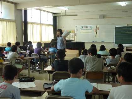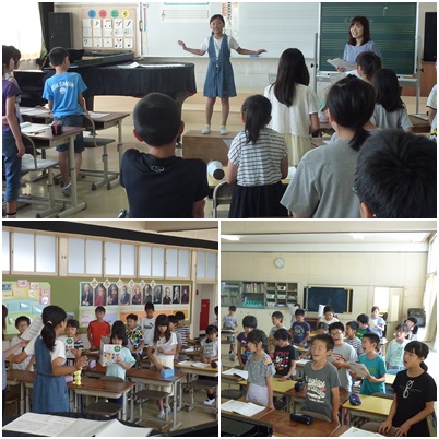 「ゆかいに歩けば」という歌を歌っている4年生。