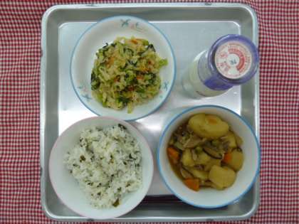 わかめごはん・肉じゃが・アーモンドあえ・牛乳でした。