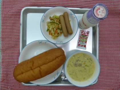 サンドイッチロールパン・コーンポタージュ・ボイルウィンナー・野菜のソテー・牛乳でした。