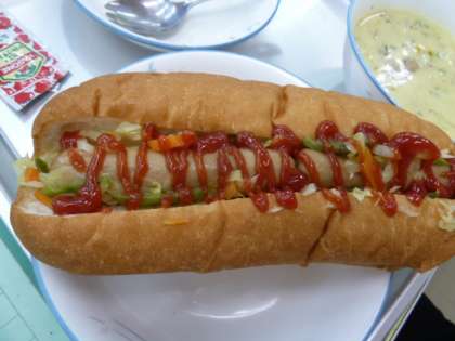 サンドイッチロールパンにウィンナーと野菜のソテーをはさんで、ケチャップをかけて食べました。