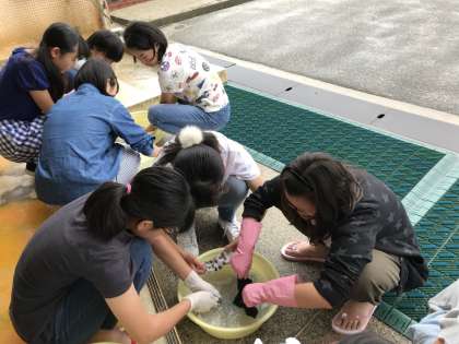 手洗いでは、洗いの後に脱水をするために絞る事、洗剤はたくさん入れてもきれいにするのには限界がある事など、注意点を確認しながら行いました。