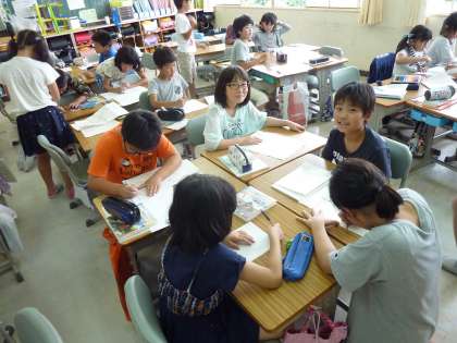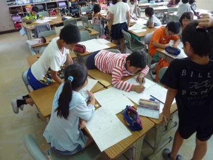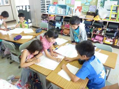 ゴミや水など、身の回りの生活に関係する新聞づくりをしている4年生。
