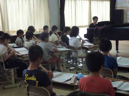 先生の伴奏に合わせて、ラバーズコンチェルトをリコーダーで演奏する6年生。