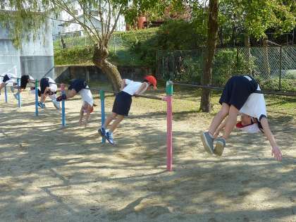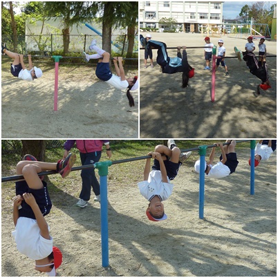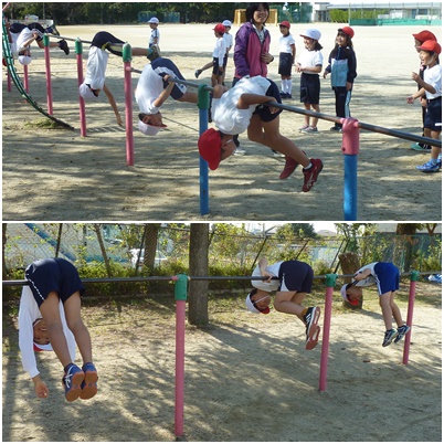 豚の丸焼きや布団干しなど、てつぼうの技に挑戦する1年生。