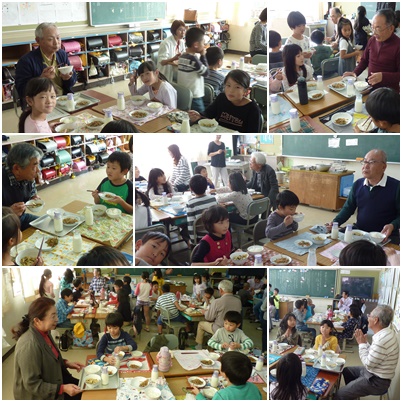 先月さつまいも掘りを一緒に行った地域の人と給食を食べる2年生。