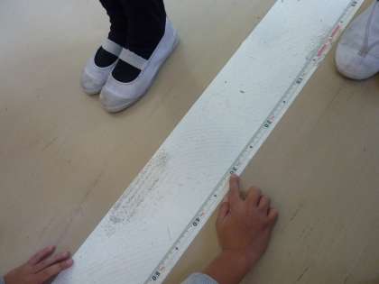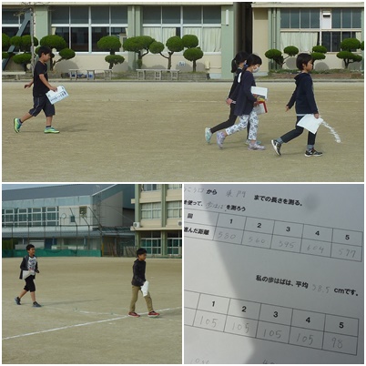 10歩の長さを測り、運動場の東西の長さや南北の長さを計測する5年生。