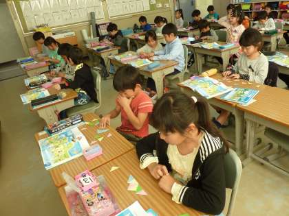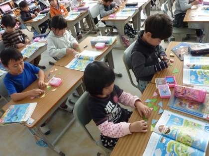 できた作品は、黒板に貼り付けて発表し、みんなで何を作ったのかあてました。