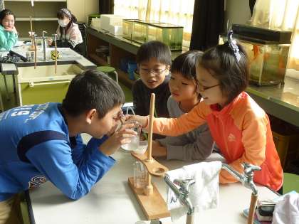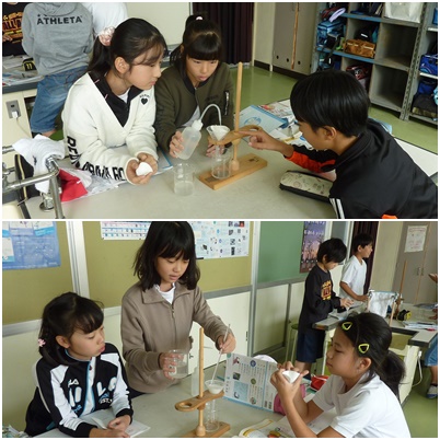 漏斗を使って液体を越している5年生。