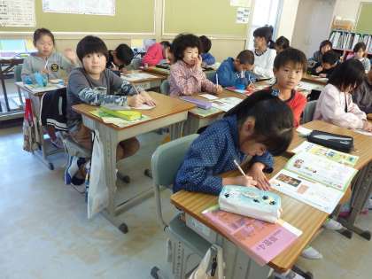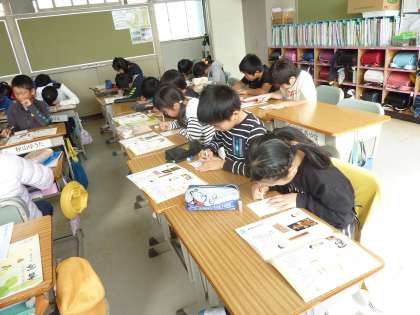 書写の授業で年賀状の描き方を勉強する4年生。