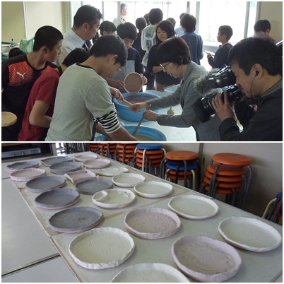 瀬戸焼きそばを盛り付けるための皿を作っている6年生。