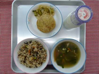 11月27日の給食 公開日 2018/11/27 更新日 2018/11/27 学校・学年ニュース 中華風ひじきごはん・かにたま・大根サラダ・チンゲン菜のスープでした。 大根サラダは、ドレッシングにごま油を入れて中華風の味付けにしました。