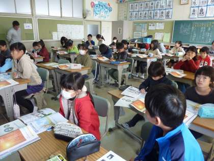 音楽の鑑賞の授業で、赤とんぼを聞く5年生。