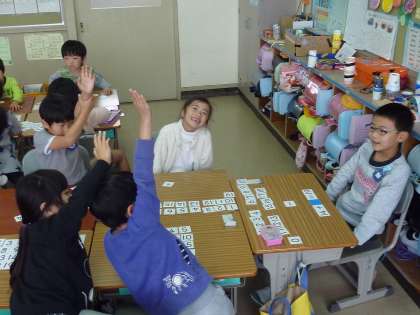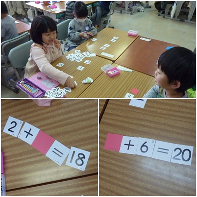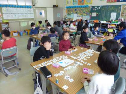 数字カードを使って式を作り、かくれた数がいくつかを考える1年生。