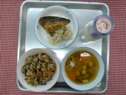 ひじきごはん・五目汁・さばの照り焼き・甘酢あえ・牛乳でした。