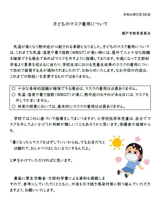 瀬戸市教育委員会より「マスクの着用について」の文書が発出されました。これまでと対応がかわるものではありませんが、ご家庭でもお子様に知らせいただけたらと思います。本日、お子様を通じて紙媒体を配付いたしました。下のリンク先にてご確認いただけます。よろしくお願いいたします。
