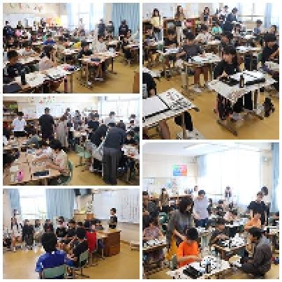 ナップザックづくりの様子です。授業支援サポーターさんに来ていただいているおかげで、操作にもかなり慣れてきました。自分たちで教え合って進めている姿もよくみられるようになりました。