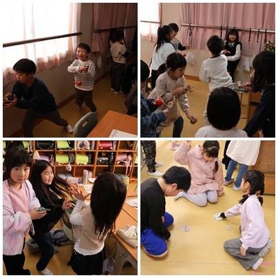 けん玉やお手玉、めんこなど昔の遊びに挑戦しました。めんこは初めて見る子も多いようです。一緒に遊んだり、やり方を教え合ったりと自然とよいコミュニケーションが生まれるのが昔の遊びのよいところです。