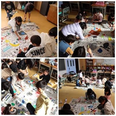 今週木曜日の学校展示会に向けた最後の作品づくりは共同制作です。大きな紙にかかれた絵に色を塗りました。絵筆だけでなく、指や拾ってきた枝などを使って楽しく表現しました。