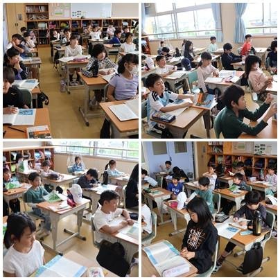 3-1の国語では、物語文に入りました。読んだお話を場面ごとに分けていきます。音読の大切さについて担任が話をしていました。