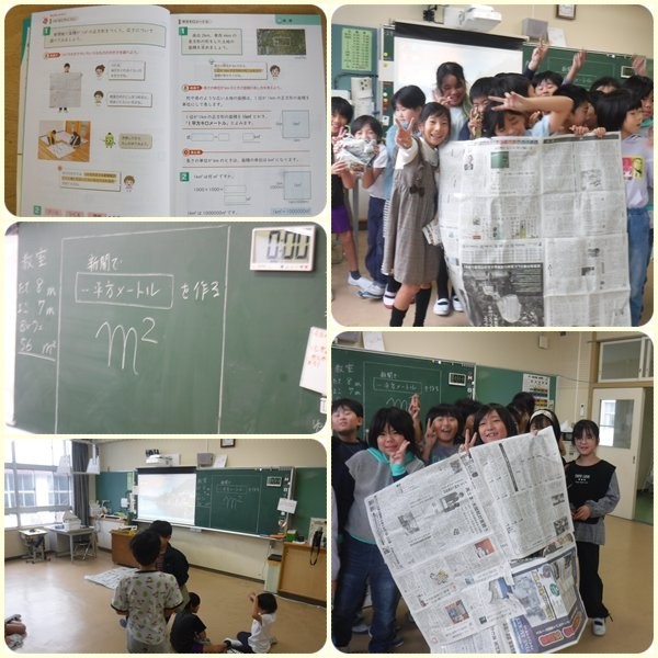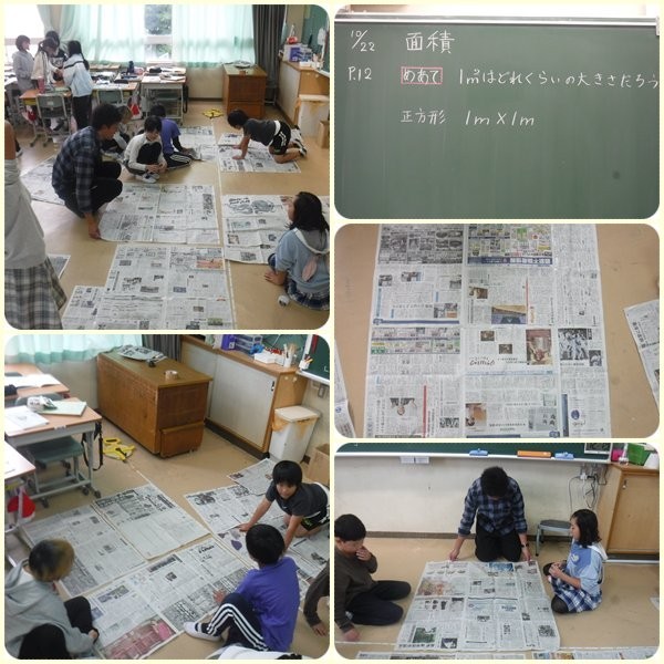 今日は1㎡の大きさを実感するために、新聞紙で1㎡を作っていました。