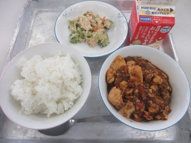『ごはん・牛乳・マーボー豆腐・バンバンジーサラダ』です!