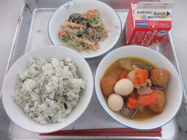 『わかめごはん・牛乳・関東煮・五色あえ』です!