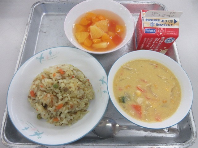 『カレーピラフ・牛乳・豆乳スープ・フルーツポンチ』です!