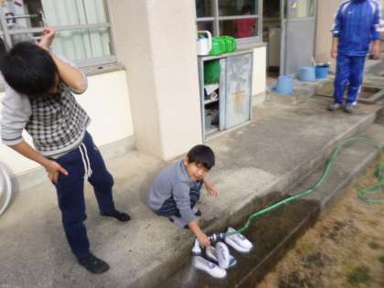 「太陽学級は」特別支援学級です。上靴を自分で洗います。