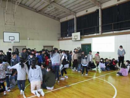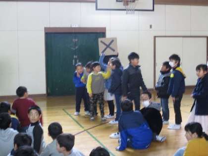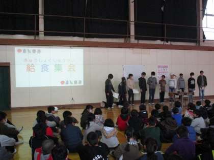 体育館では、給食集会が行われました。給食委員から給食のルールやマナーについての「○×クイズ」が出されました。