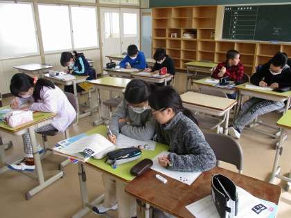 6年生の教室からです。算数の授業でした。2つの教室に分かれて、練習問題を解いていました。