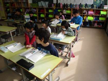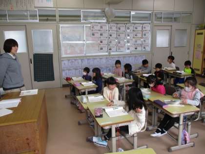 1年生の教室からです。国語の授業でした。問題を考えていました。