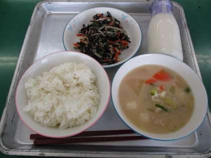 今日の献立は、洋風団子汁、鶏ささみとひじきのあえもの、ごはん、牛乳です。