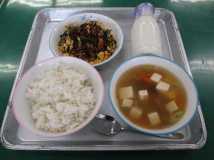 今日の献立は、わかめスープ、ビビンバ、麦ごはん、牛乳です。
