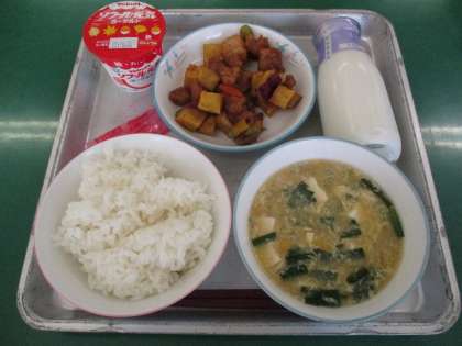 今日の献立は、中華風コーンスープ、さつまいもと鶏肉のてり煮、ごはん、牛乳、ヨーグルトです。