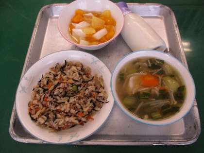 今日の献立は、水ぎょうざのスープ、あんにんフルーツ、中華風ひじきごはん、牛乳です。