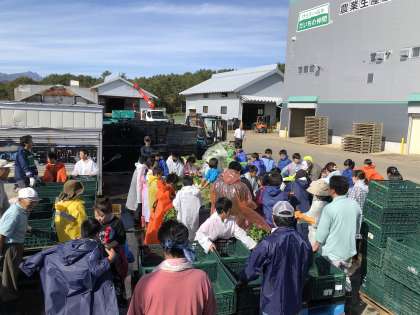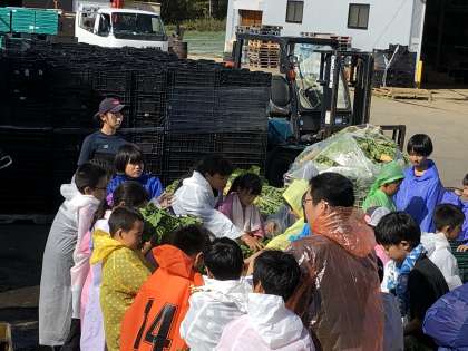 昼食後は、畑で収穫した大根を大きなパレットで洗ってカゴにつめました。みんな濡れながら頑張っています。